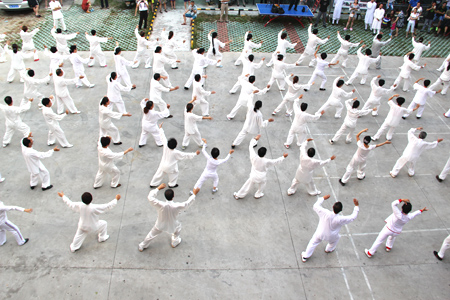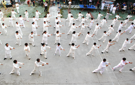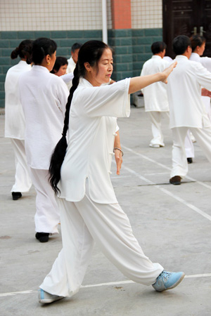 汇演中,扎着过腰的乌黑长辫子的王玲比较显眼,长辫子随动作的变换轻微摆动,不时有观众拍她的特写。58岁的她之前零基础,“为了跟进度,上午跟自己教练学,下午去其他班蹭课,清晨和晚上就和拳友们在广场上自练。这10天咽炎犯了,怕耽误课没时间去打针,就一直扛着。”王玲说,和她一样拼命的学员还有很多,大家都是出于对太极和传统文化的热爱。“还有不少学员想前往武当山深造呢!”