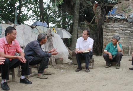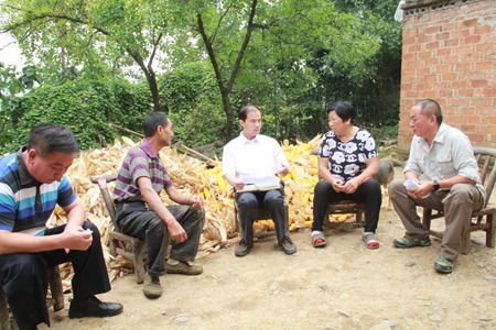 家住中村村1组的徐运常今年74岁,老伴73岁,与一个外孙相依为命。外孙已去深圳打工,现在只剩两位老人居住在几间土坯房里,房屋四周300米以内都是耕地,住房差、行路难、用水难是老人们最希望解决的问题。柯大成走进徐运常家中,实地察看了老人居住条件,并坐下来与老人唠起家常。从身体健康状况、家人在外打工境况,再到扶贫工作队开展建档立卡工作,柯大成边问、边记。在交谈中,柯大成说:“精准扶贫是一项重要的民生工程,像徐运常家这种情况,就是要帮扶的对象之一。当前首先要做的是帮他们搬迁到公路附近,用水、用电、出行都会方便,周围也有邻居的照应。”柯大成还叮嘱现场的镇村干部,要做好沟通协调工作,尽早实施搬迁扶贫计划,让老人安享晚年。