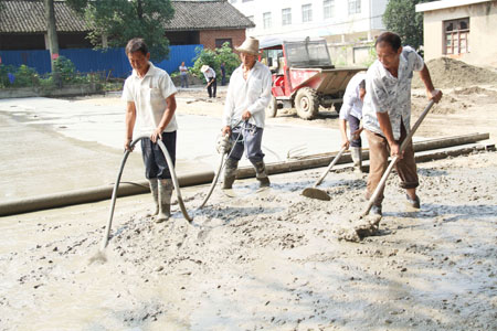 日前,城关镇晓阳村的群众正在为晓阳小学硬化操场。以前,该村的小学操场是一片杂草丛生,严重影响了师生的体育活动。为改变学校面貌,村“两委”积极支持学校建设,投入资金20万元,硬化操场2500平方米。(赵爱平 徐家庆摄)