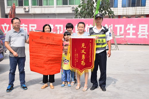 2015年8月26日上午10时许,受害者许女士正在房县东门邮政局自动取款机上取钱,当她刚把钱拿到手的时候,身后等待已久的一年轻男子迅速抢走了徐女士手中的钱,飞奔而逃。许女士也是第一次遇到这样的情况,一时间不知所措,无奈只好大喊:“抢钱咯,我的钱被抢了”。路人都观望,却无人理会,此时正遇到在东门执勤的肖正超,见此情景,他二话不说,便不顾一切的向抢钱者所跑方向猛追过去,追逐了近100米,抢劫者见逃跑无望,丢下现金后溜之大吉,被抢的钱物夺回后分文不少的交到许女士手中,许女士对肖正超表示万分感谢。8月28日上午,为表达感激之情,许女士带领家人一起将一封感谢信和一面锦旗送到肖正超手上,并表示了由衷的谢意。