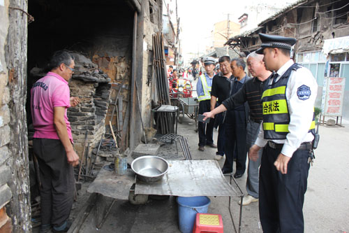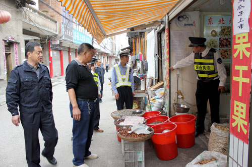 在市容管理工作中,大力推行“城管执法五步法”,即一规劝告知、二警示取证、三限期整改、四责令保证、五坚决取缔的人性化管理模式。一规劝告知即对管理事项提前介入,做好宣传教育,规劝为主,赢得广大商户的理解与配合;二警示取证即根据需要,对规劝无效的管理对象下达警示通知书,将违章时间、行为、次数一一记录并将违法行为录像取证;三责令整改即对多次违反市容管理规定的管理对象要求其限期整改;四责令保证即对屡次管理仍未整改的责令其写出保证书,以观后效;五坚决取缔即对做出保证书后仍未改正的违章摊点,依法予以取缔。据统计,去年以来,共通过劝导制止各类违章行为800多起 ,采取帮助经营户搬运货品、清理摊位杂物等方式协助经营户自行整改250多人次。