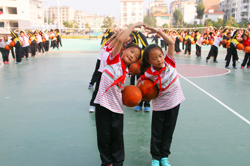 据悉,这是该校体育组自编自导的一套为小学生减压提趣的“篮球操”,学生们每天课间操练习10分钟“篮球操”,以加强学生的运动量,缓解学生的学习压力,增强学生的身体素质。