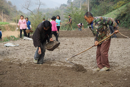 日前,五台乡金牛寺村农民正辛勤播种梭椤树种。据悉,五台乡采用土地流转方式发展梭椤育苗100亩,此举可为当地农户每亩增收400元,年吸纳用工量8000个劳动日,可生产树苗30万株,造林1.2万亩。 (况建强 摄)