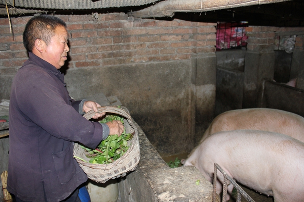 方之富老人正在猪喂青饲料