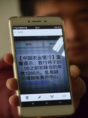 2日下午5时许,房县农业银行工作人员也打电话向房县公安局反映,有多名市民找到银行说收到银行卡扣千元年费的短信。