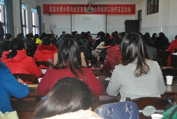 今日房县网讯 通讯员王婧玥报道: 加强房县天明小学与北京市良乡中心学校两校间的友好帮扶合作,6日,良乡中心学校的优秀班主任杨金娟和主任王海英在李庆华校长的带领下,来到天明小学开展了对口协作交流活动。