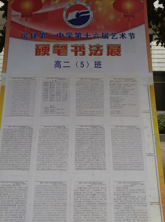为充分发挥艺术教育的育人功能,以艺养德,以艺启智,促进学生全面发展,提高学生综合素质,该校把一年一度的艺术节当作展示学校艺术教育成果、发挥学生艺术特长、实现学生艺术梦想的舞台,而举办师生硬笔书法作品展一直是该校艺术节的一项重要的传统活动。作品以班为单位展出,所展作品都是从本班同学提交的作品中遴选出来的优佳者。