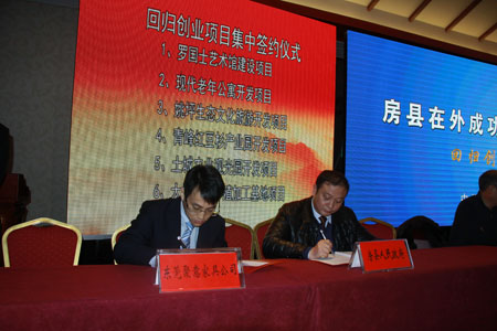 座谈会上播放了房县回归创业宣传片《房县我永远的家》,北京房县商会会长付海兵致贺辞。县委常委、副县长高明哲代表县委、县政府与回归创业代表现场签订了罗国士艺术馆建设项目、现代老年公寓开发项目,青峰镇、土城镇、大木厂镇、姚坪乡人民政府分别与回归创业代表签订了青峰红豆杉产业园开发项目、土城农业观光园开发项目、大木肉牛养殖加工基地项目、姚坪彪虎沟生态文化旅游开发。在外创业成功人士余行兵、孔凡强等作了商会情况介绍及回归创业打算,对家乡经济社会发展谈了自己的看法,提出了宝贵的意见和建议。他们纷纷表示,将努力抓住建设绿色房县、创新房县、法治房县、文明房县、小康房县的宝贵机遇,积极投身于房县建设中,与家乡人民一道为促进房县经济社会持续快速发展作出更大贡献。
