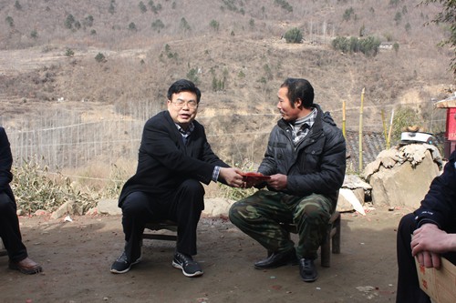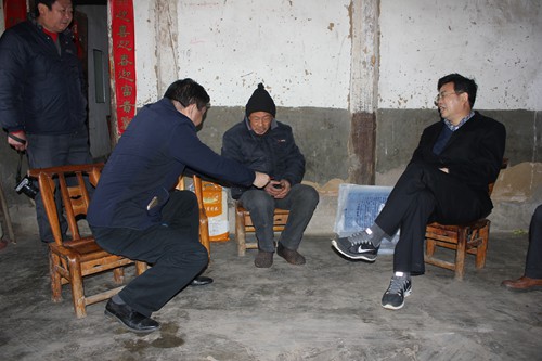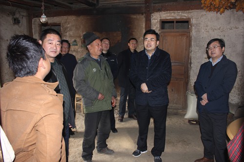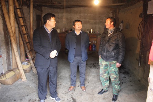 在白鹤镇黄杨村,孙学余先后走访了许明炳、王明金等3户贫困户,为他们送去大米、食用油和慰问金。每到一户,孙学余都与他们亲切交谈,认真询问过去一年的经济收入、产业发展以及扶贫政策落实情况,了解他们2016年产业发展意愿,并和他们共同探讨脱贫规划。许明炳家住的是破旧的土墙房,儿子和女儿都在外地读大学,一家人的生活主要靠他一个人。2015年,工作队了解到他缺发展资金的情况后,积极帮助他筹措资金,让他饲养了4头猪,年底卖了8000元,加上种植的4亩地的玉米、黄豆和打临工挣的钱,一年下来,实现了2万多元的收入。在经过深入交流后,孙学余鼓励许明炳坚定发展信心,在2016年重点做好四件事,一是建新房,二是继续饲养生猪,并扩大养殖规模,三是供两个孩子完成学业并实现就业,四是抓好原有的经济作物。党和政府会将建房扶贫补贴和各项惠农政策落实到位,同时给予他资金和技术支持,力争帮助其早日脱贫致富。