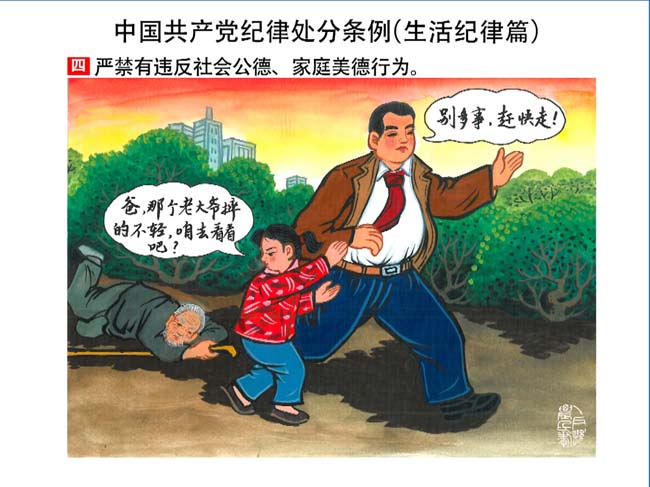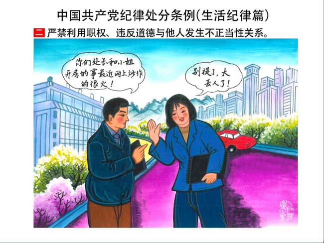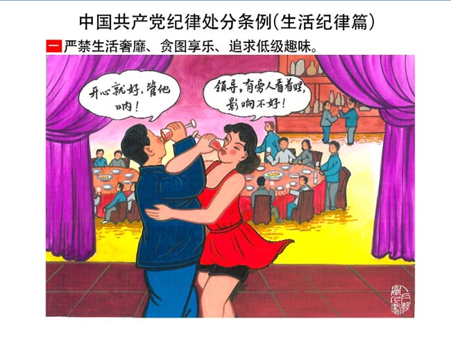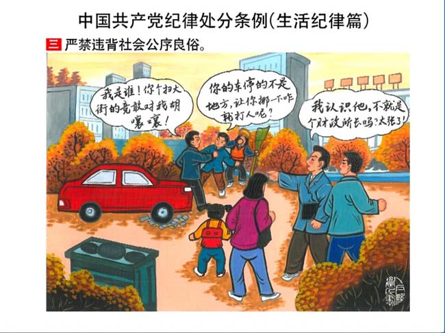 新修订的《中国共产党纪律处分条例》,将党章和其他主要党内法规对党组织和党员的纪律要求细化,充分体现了党纪严于国法。在“分则”原来以破坏社会主义市场经济秩序等为主的十类违纪行为,整合规范为政治纪律、组织纪律、廉洁纪律、群众纪律、工作纪律和生活纪律等六类,使《条例》的内容真正回归党的纪律,为广大党员开列了一份“负面清单”。 为帮助广大党员干部进一步学习、掌握党内法规,清楚底线、明白规矩,县纪委推出“农民画解读‘六大纪律’”系列,以供大家学习。