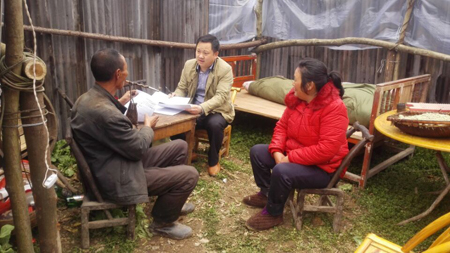 贫困户陈元龙向扶贫工作队介绍正在平整的新房屋基