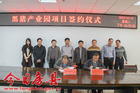 今日房县网讯 记者 吴宏强 报道: 19日,县人民政府与十堰金煌房地产开发有限公司签订总投资2.5亿元的黑猪产业园项目。十堰金煌房地产开发有限公司董事长高良涛,县委常委、副县长高明哲,县人大常委会副主任谢永翔,县政府党组成员李相明、付必久及相关单位负责人参加签约仪式。