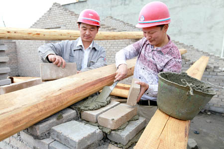 “五一”期间,刚获得“五一劳动奖章”的马勇(右)忙碌在军店老街修复项目工地上