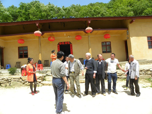 游客们一部分围在鱼塘边上钓鱼,更多的妇女小孩在水天坪六百多亩的药材基地观赏芍药、丹参、柴胡、百合,还有一些游客在田地间采集野菜——黄花苗、野蒜、车前草、枯牛蔸(夏枯草)、水灯草、鱼腥草等。中午时分,散落各处的游客渐渐聚拢到了汪大政家里。汪大政家利用精准扶贫农房改造资金,将农村砖瓦房修旧如旧,古色古香。房子一溜五大间,黄泥墙的大厅摆了六张带转盘的餐桌。