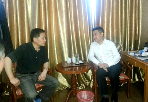 应急善后工作小组组长、副县长姚峰(右)与中国水电十二局党委书记郦平进行会面