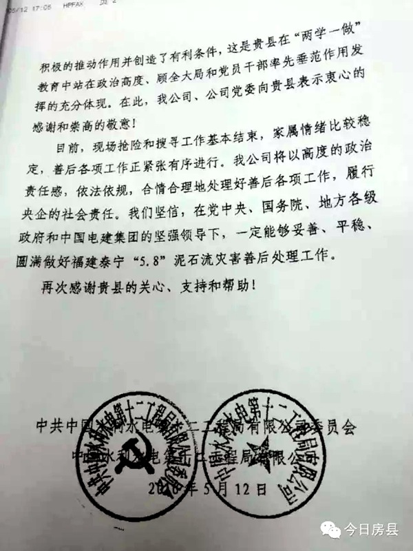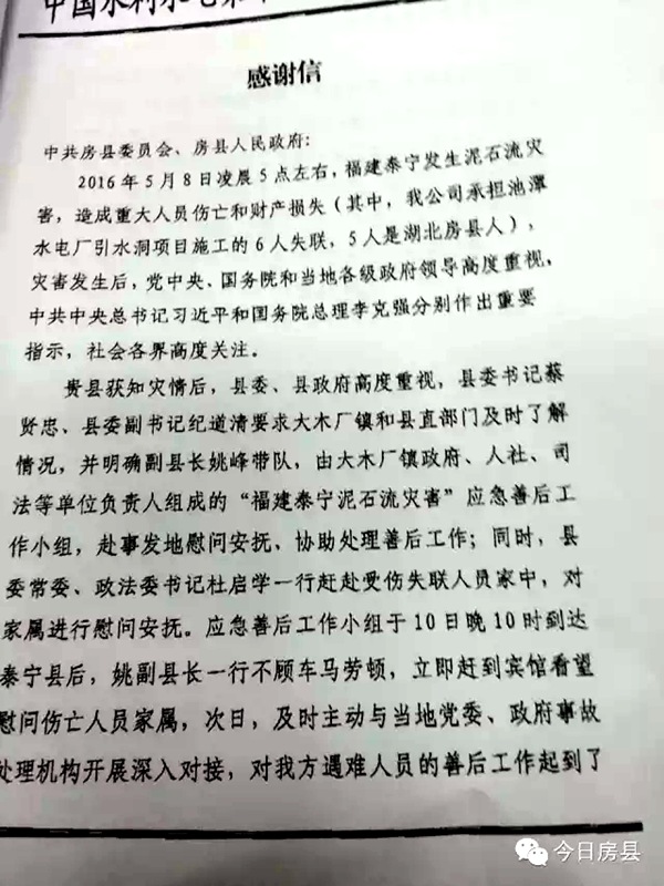 今日房县网讯 通讯员 高志 报道:5月13日,中国水利水电第十二工程局向房县县委县政府发来感谢信,对房县县委、县政府在福建泰宁“5.8”泥石流灾害中积极参与8名大木籍受伤、失联人员家属的慰问安抚、协助处理善后工作表示感谢。
