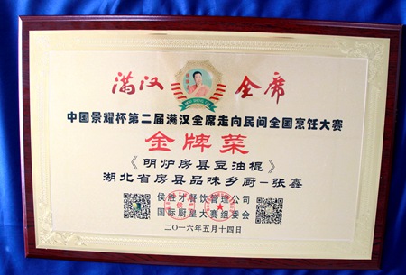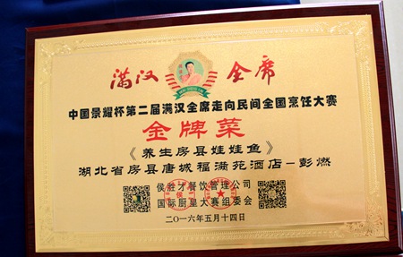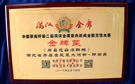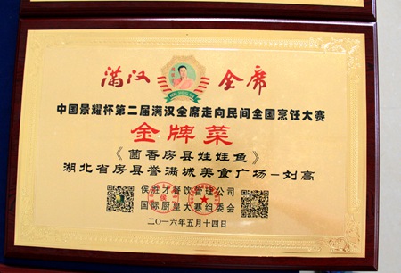 今日房县网讯 记者刘臣 报道:5月14日,在北京郁金香酒店举行的“中国景耀杯第二届满汉全席走向民间全国烹饪大赛”中,由房县餐饮协会、房县大鲵产业办组织县内4家餐饮企业获得4项“金牌菜”最高荣誉。全国160多家知名餐饮企业参加此次比赛,最终评出10项“金牌菜”,我县就获得了4项。