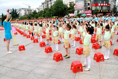 当天的活动在幼儿老师《创造奇迹》舞蹈中开始,接下来两个多小时里,全部为亲子互动表演。亲子操《海宝来了》《开心向前飞》,展示了幼儿园的活动因为有家长的参与变得更加精彩和生动。《七彩环保时装秀》表演时装都是由旧包装纸制作而成,表现了家长和孩子们的无限创意,尽情绽放出美丽、时尚、环保和温馨。用红凳子及用彩色充气棒作为道具的大型团体器械操、互动游戏,分别由全园幼儿及其家长参与完成,数百名孩子和家长统一着装,表演场面十分壮观,一时间美丽的西河之滨成了欢乐的海洋。大型互动游戏培养了孩子们的合作意识和团队精神,孩子们个个神采飞扬 ,家长们个个笑逐颜开。