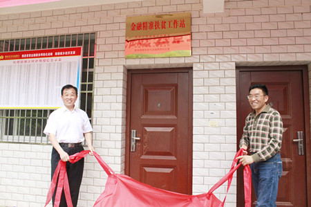 市政府副秘书长贾学云、人行十堰中心支行副行长陈万和为红塔镇潮汪村金融精准扶贫工作站揭牌