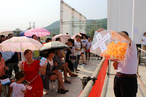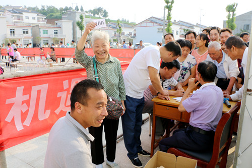 回龙乡红星村66岁的赵胜云老大妈第一轮第三个抽签,她兴奋地将抽中的序号“100”举过头顶向众人展示,脸上的喜悦溢于言表。