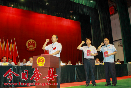 新当选的县人大主任蔡贤忠、县人民政府县长纪道清、县人民法院院长王俊卿宣读誓词