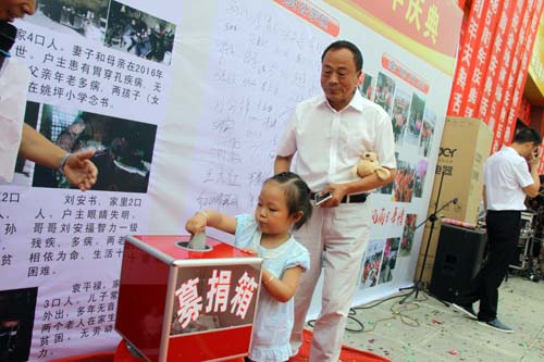 义捐中,公司总经理柴长胜第一个上台个人捐赠800元,随后广场内当日上班的员工纷纷排队奉献爱心。活动同时也感染了现场的观众,一位叫王慧的顾客在购物时返了20元现金,她又自掏了几十元,一并放入募捐箱内;一位爷爷带着三岁半的孙女上台捐款,并在捐款签名墙上签上了孙女“宋佩凝”的名字,他说,从小要培养孩子拥有一颗善良的心。当日上午共捐款近5000元,这些善款将全部用于为姚坪乡西坡村5户残疾人购买生活必需品。据公司副总经理余天学介绍,公司还将把庆典当日销售利润的5%拿出来用于公益事业。