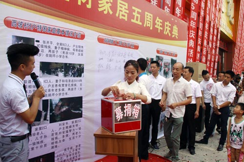 位于西河岸边的房县金地家具建材广场开业五年来,在诚信经营的同时,还积极履行社会责任,35个入驻的品牌家具建材专营店共解决就业人员近400人,他们中大多为企业下岗职工。公司还专门成立了爱心义工队,多次参加社会公益活动。这次五周年庆典,公司得知姚坪乡西坡村五户残疾人,经济比较贫困,有的还没看上电视时,决定举办义捐活动。