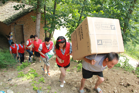 车不能到的地方,志愿者们将捐赠物资手抬背扛至捐赠对象家中
