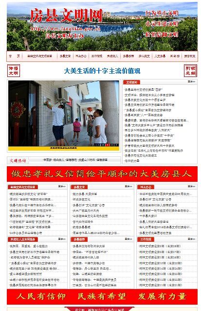 新版“房县文明网”调整设置了“文明要闻、经验交流、文明学堂、房县文艺、网上办公、未成年人、志愿服务、房县榜样、工作简报、养心美文、黑红榜、人文房县、图说文明、公益广告展播”14个栏目。首页是县城全景图,网页以中国红为主基调,穿插“行为举止文明、心灵生活文明、价值信仰文明”“人民有信仰、民族有希望、发展有力量”“树立文明观念、争当文明公民、展示文明形象”等醒目标语,视觉冲击力强,严肃又不失活泼。