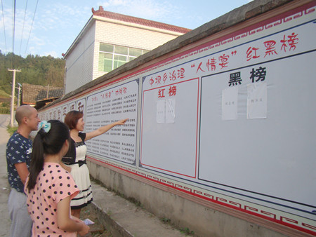 近日,在中坝乡党风廉政建设宣传墙上,除了早前发起的人情宴“劝诫歌”,现在又推出了“红榜”和“黑榜”,红、黑榜泾渭分明,给全乡党员干部和群众敲响了严肃治理人情宴的警钟。随着升学季的到来,该乡为刹住人情宴不正之风,杜绝乱操乱办,再出狠招,特推出“红榜”和“黑榜”,让乱办人情宴这股歪风无处遁行。图为近期表扬的两位主动放弃操办人情宴和查处的两位违规办理人情宴人员名单。 (何玲玲 汤亚军 摄)