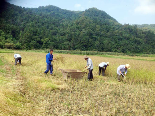 近日,军店镇指北村贫困户正在自己田里收割胭脂米水稻。这些水稻共有200多亩,涉及贫困户52户,县委办公室扶贫工作队进驻该村后,因地制宜引导贫困户种植胭脂米,所有贫困户均享受免费提供种子、化肥、技术、销售等服务。受旱灾、风灾、暴雨等影响,今年胭脂米稻谷收成比去年亩平减产50斤左右。(沈 云 摄)