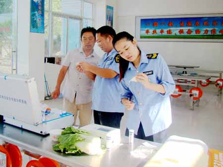 近日,在中、小学开学之际,中坝乡食品药品监督管理所工作人员对全乡各学校食堂食材进行抽样快检。据悉,食品快检作为一项常规化工作,一直将学校食堂、食品店、小吃店作为重点检测对象,居民也可以将自家购买的食材送来检测,能快速检测出日常食用的蔬菜、食用油、肉类、水果等是否含有有害成分,确保舌尖上的安全。(何玲玲 李荣荣 摄)