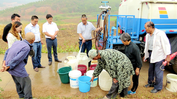 19日,军店镇组织两台水车为因旱灾而缺饮水的群众送水。