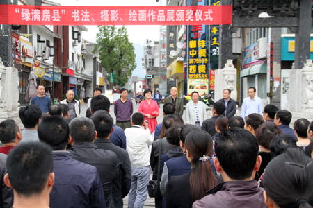 今日房县网讯 记者 赵爱平 高书文 通讯员 张立林 报道: 10月9日, 在欢度国庆、喜迎重阳的节日气氛中,“绿满房县”书法、摄影、绘画大赛颁奖仪式在唐城广场举行。县委常委、宣传部部长徐锦凤为活动致辞,并为部分获奖者颁发证书。
