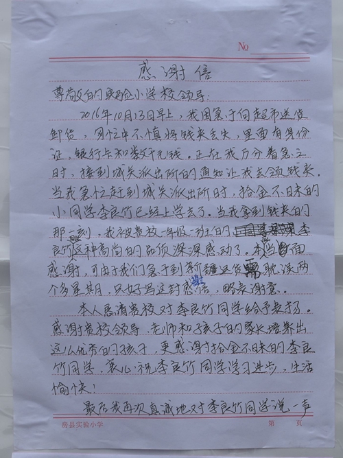 今日房县网讯 通讯员 林鹏 报道: “我被房县实验小学李粮竹同学这种高尚的品质深深感动着,本人本应当面表示感谢,可由于急于到新疆送货,需要耽误两个多星期,只好写这封感谢信,委托城关派出所把这封信送到该校,本人深表谢意!感谢实验小学,培养出如此优秀的学生。”……10月16日,李珍女士把一封感谢信委托城关派出所送到房县实验小学,对李粮竹同学拾金不昧的行为表示感谢。