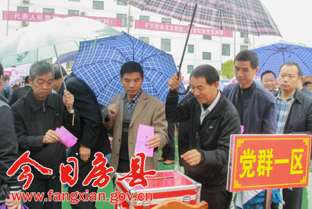 工作人员在对有关事项进行说明后,经全体选民举手表决,大会选举办法及监票人、计票人名单获得通过,监票人检查票箱,工作人员向选民发放选票,并对填写选票的方法和应当注意的问题进行详细说明。蔡贤忠等领导依次领取选票、认真填写,并走到票箱前郑重投上选票。其他选民也依次排队将填好的选票投入票箱,依法行使自己的民主权利。该选区将选举产生县十八届人民代表大会代表2人。