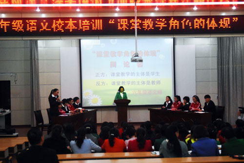 六年级语文组围绕课堂教学角色的体现展开活动。正反双方就课堂教学主体是学生还是老师进行辩论。教师们的辩论引古博今,有理有据;孩子们自己切身感受的加入,让辩论更有说服力。场上辱枪舌战,场下所有的老师们也积极参与到活动中来。这种新颖的培训方式,得到了大家的一致好评。下一篇:房县一中大力开展课堂教学研讨活动