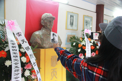 今日房县网讯 记者 高书文 报道: 10月25日上午,在雷天明烈士纪念馆内,参加北京新四军研究会五师分会“重走突围路”活动的朱颜,左手将姥爷庞俊青年时代的黑白照片,举至雷天明纪念像肩头位置,右手按下快门,为曾为战友的二人拍下一张"合影"。