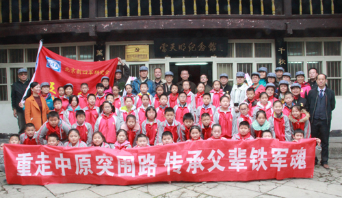 “重走突围路”由北京新四军研究会五师分会组织。在中原突围战役胜利70周年之际,五师后代一行18人,在研究会副会长李炎的带领下,沿李先念部(二纵)突围路线和沿王树声部(一纵)突围路线,追寻先辈足迹,了解先辈革命事迹,学习和弘扬伟大的中原突围精神。