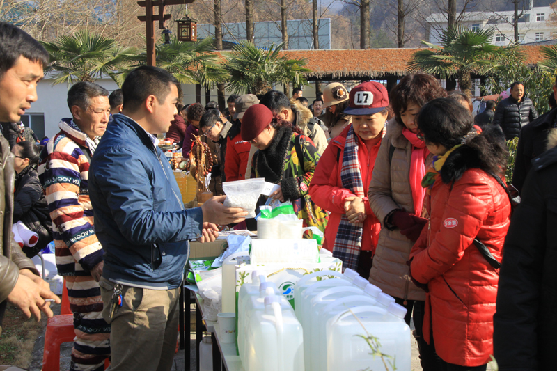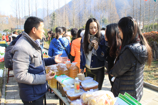 当日暖阳高照。十点许,五辆载满十堰游客的旅游大巴如约而至,数百辆自驾游车辆陆续抵达。2000多名游客进入活动现场,大家顺着展台驻足观看,争相购买,人头攒动、热闹非凡。
