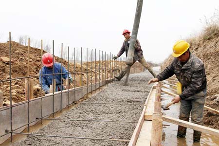 近日,施工人员正在马栏河月明段加固除险河堤,我县累计投资6亿多元,除险加固城乡病险的河道堤防工程,保障沿河两岸人口安全、农田安全、企业安全和道路交通安全。目前,已完成治理的城乡中小河流53公里,惠及城乡30万人口安全。图为施工人员正在浇筑钢筋混凝土堤基。 (张启龙 摄)