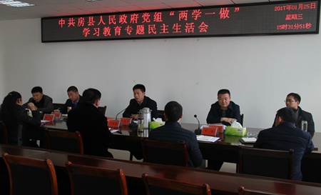 今日房县网讯 记者刘臣 报道:1月25日,县政府党组召开了以学习贯彻党的十八届六中全会精神为主题的专题民主生活会,政府党组成员围绕“两学一做”学习教育要求,对照《关于新形势下党内政治生活的若干准则》《中国共产党党内监督条例》,对照省十二届人大五次会议、市第五次党代会、县第十四次党代会的主要精神,结合思想和工作实际,进行党性分析,开展批评和自我批评,进一步严肃党内政治生活,不断增强发现和解决自身问题的能力,为推进房县“四化”协调发展示范区建设凝聚正能量。