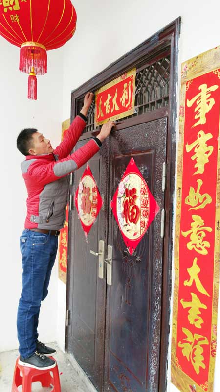 大年三十,是辞旧迎新的时刻。一大早,记者在我县乡村各地看到,家家户户都在忙着张贴春联,到处洋溢着春节的喜庆气氛。火红的春联贴出了喜庆,贴出了年味儿,更贴出了人们对新一年生活的美好希望和祝愿。图为黑獐沟搬迁安置小区户主张先生正在张贴春联。