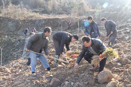 近日,记者在白鹤镇堰河村立石寺看到,当地村民正在梭罗树基地里套种金银花。