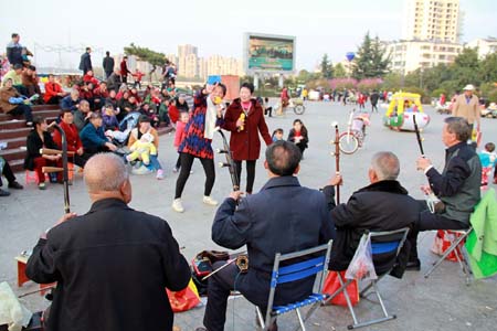 近日,西河广场上,城关镇老城社区文艺队员正在演奏自编的《精准扶贫人人有责》《忠孝礼义信简俭平顺和》等歌曲。该镇由民间文艺骨干组成的义务宣传队有12支,他们分别在乡村、社区演唱自编歌曲,宣传十八届六中全会精神、准扶贫政策、精神文明建设等内容,受到了广大干部群众的赞赏。
