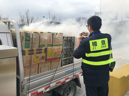 2月27日下午,一辆小型货车准备进入十房路段房县收费站时,亭外执勤的收费员发现该车车尾处冒出滚滚白烟,立即示意司机停车,并迅速拿来车道灭火器材进行灭火。