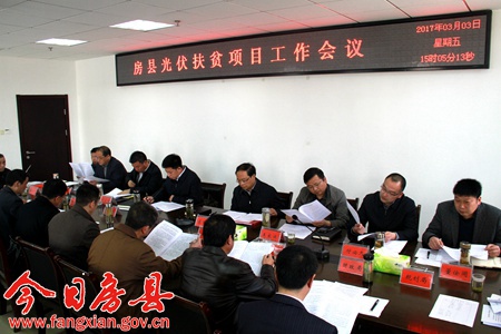 今日房县网讯 记者刘臣 报道:3月3日,我县召开专题会议,研究部署光伏扶贫项目工作。县领导蔡贤忠、纪道清、王家波、肖大有、付必久、丁杰、董诠闻,县政府党组成员熊祖友出席会议。