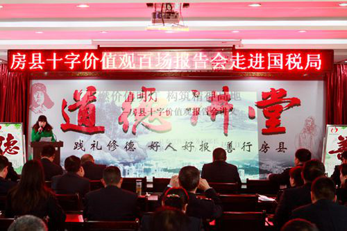 今日房县网讯 通讯员 毛长毅 报道: 近日,房县弘扬十字价值观宣讲团走进房县国税局,为参加活动的全体干部上了一堂生动、实在、发人深省的“道德课”。