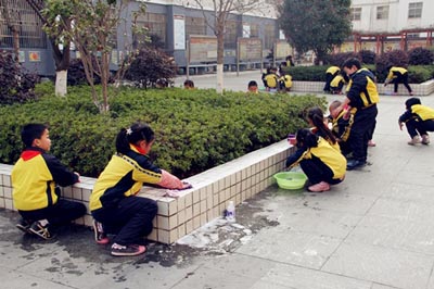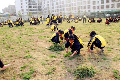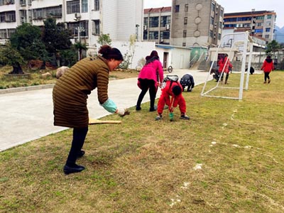 活动中,一部分师生进行“爱绿护绿”活动:他们有的弯腰除草,有的拿着水桶浇水,有的把锄好的草运到垃圾房;一部分师生进行“靓洁校园”活动:他们有的拿着抹布擦着墙壁;有的拿着盆子端水,有的拿着扫帚扫地;虽然大家累的汗流浃背,但看着眼前焕然一新的景象,每个人的脸上都露出了欣慰、快乐的笑容,整个校园呈现出一派热火朝天的劳动场面。