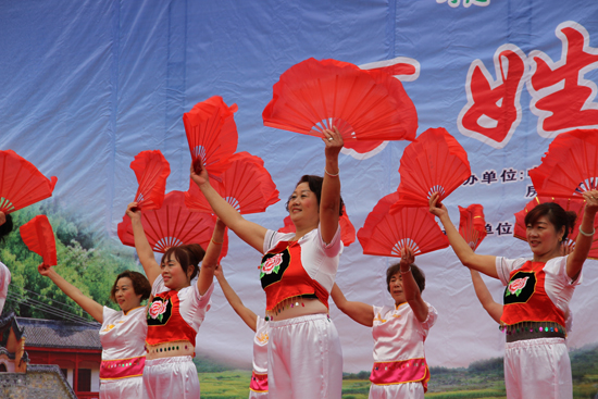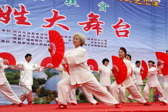 “卧似一张弓,站似一棵松,不动不摇坐如钟,走路一阵风……”伴随着雄浑高昂、铿锵有力的歌声,房县武当太极协会的会员们手拿红色太极扇,先开步抱扇,后弓步举扇,动作干脆利落,舒展游刃。虽然是一群中老年人,但他们轻盈舒展的动作透出“朝气”,充分展示出房县倡导全民健身的成效。特别是鹤发红颜的领队张华,动作飘逸潇洒,又阳刚威仪,得到观众的阵阵喝彩。